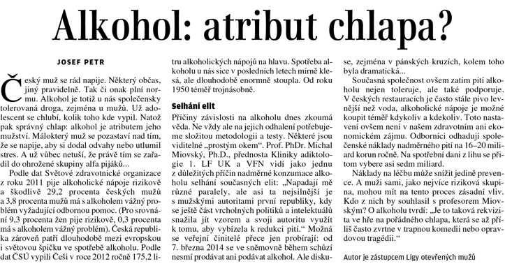„Český muž se rád napije. Některý občas, jiný pravidelně. Tak či onak plní normu. Alkohol je totiž u nás společensky tolerovaná droga, zejména u mužů.“ Článek LOMu o mužích a alkoholu, který vyšel 26.3.2014 v