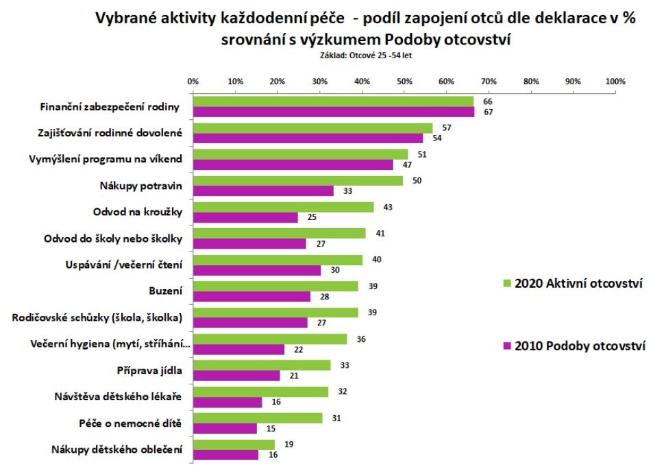 Mezi činnosti, ve kterých došlo ve srovnání s rokem 2010 k nejvyššímu růstu zapojení otců, patří vodění dětí na kroužky, nákup potravin, návštěva dětského lékaře, péče o nemocné dítě nebo večerní hygiena dětí, kde se míra deklarovaného zapojení otců zvýšila z 15 % (2010) na 31 % (2020). Díky tomu, že otce můžeme dnes častěji potkat i v ordinacích dětských lékařů, také slábne jejich přesvědčení, že o nemocné děti se nejlépe dovede postarat matka, i když s tímto tvrzením stále souhlasí 77 % českých otců (v roce 2010 to však bylo 89 %).