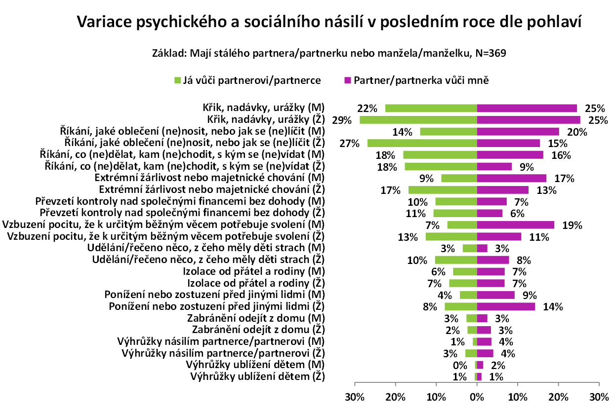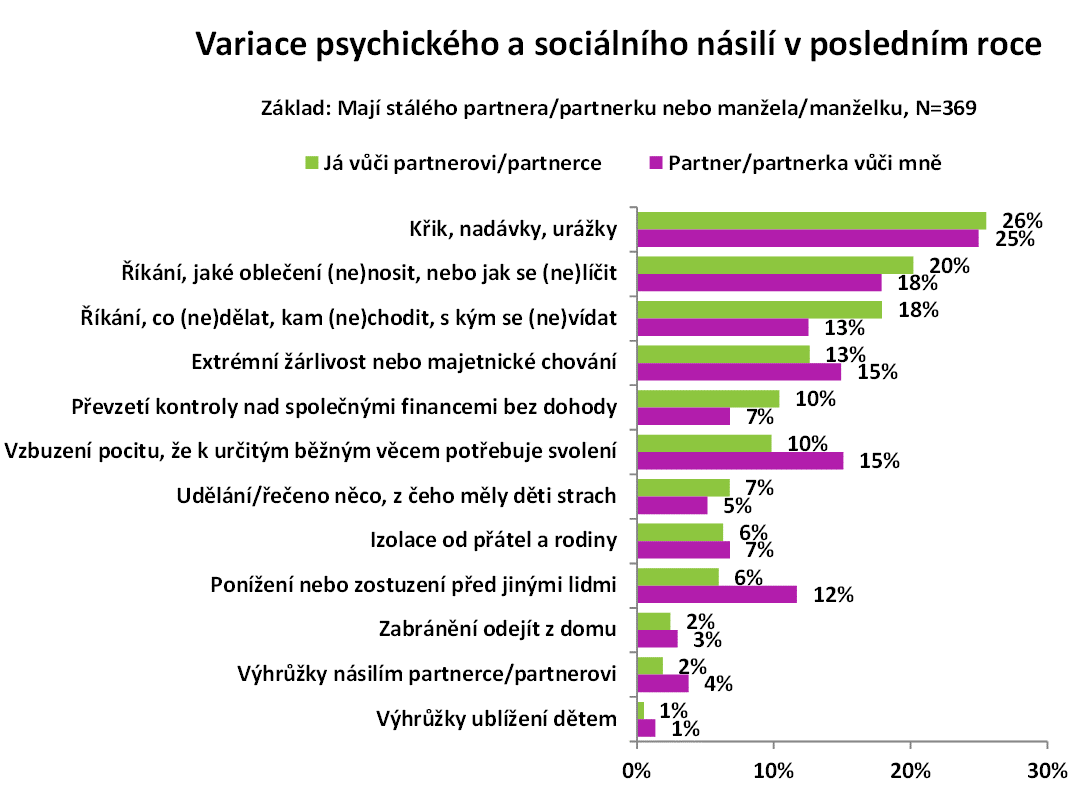 Výzkum mapoval také výskyt různých forem psychického a sociálního násilí, které zatím společnost bere v úvahu mnohem méně než násilí fyzické nebo sexuální. Čtvrtina dospělých (25 %), kteří žijí v dlouhodobém vztahu, přiznává, že v něm používá nebo zažívá alespoň občas křik, nadávky a urážky. Mezi další poměrně časté situace patří například ponižování před jinými lidmi (6–12 %), extrémní žárlivost (13–15 %) nebo izolování partnera či partnerky od přátel a rodiny (6–7 %).