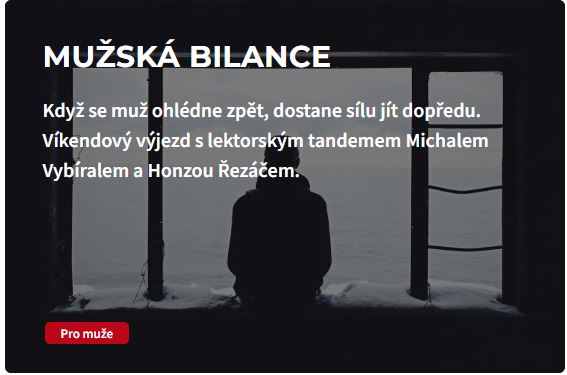 S blížícím se podzimem a návratem dětí do školních lavic nastává ideální čas vyhradit si trochu prostoru pro sebe. Letos na podzim proto otevíráme hned tři seberozvojové kurzy pro muže, kteří na sobě chtějí pracovat. Dlouhodobý kurz Mužská cesta, který proběhne jak v Praze, tak i v Brně, a víkendovou Mužskou bilanci, rozvojový kurz na čerstvém vzduchu!